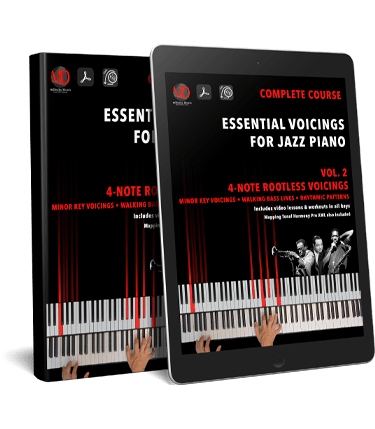 There are many reasons why you should learn and play 4-note voicings. Although 2-note and 3-note voicings are also effective, 4-note voicings provide a well-rounded, interesting and coherent harmonic context, they are not too ambiguous while still allowing the bass-line to flow nicely even when the bass player introduces inversions or reharmonizations. Also, 4-note voicings are very easy to understand and play since, as we will see later, they are just an evolution of simple seventh chords.