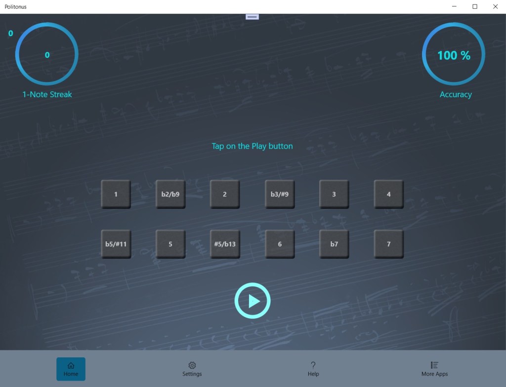 Politonus is a multi-pitch ear training app. You can practice from 1 to 11 simultaneous notes. To start, tap on the play button. A I-IV-V7-I cadence will be played followed by the note/s you have to identify. Tap on the notes you think you’ve heard to submit your answer.