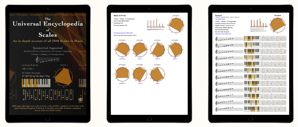 This method was used in The Universal Encyclopedia of Scales to find all possible scales in music and organize them by groups of related modes and symmetry. Every group of related modes is shown in an page dedicated to that group, and each scale is shown in its own page in all keys: As music notation, on a piano keyboard and a guitar fretboard