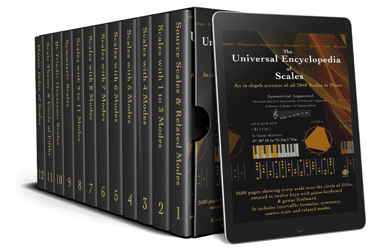This method was used in The Universal Encyclopedia of Scales to find all possible scales in music and organize them by groups of related modes and symmetry. Every group of related modes is shown in an page dedicated to that group, and each scale is shown in its own page in all keys: As music notation, on a piano keyboard and a guitar fretboard