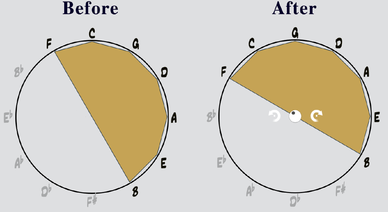 - Get the scale in all keys by rotating the note labels, without rotating the polygon, one node at a time. Make sure the top note in the circle is always a vertex of the polygon.
