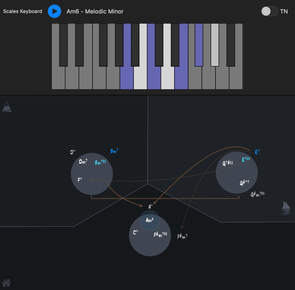 So let’s set the map up to the key of A minor and add the I minor. The first thing to notice is that the i minor is paired with the melodic minor scale by default.