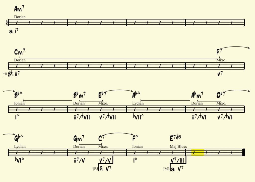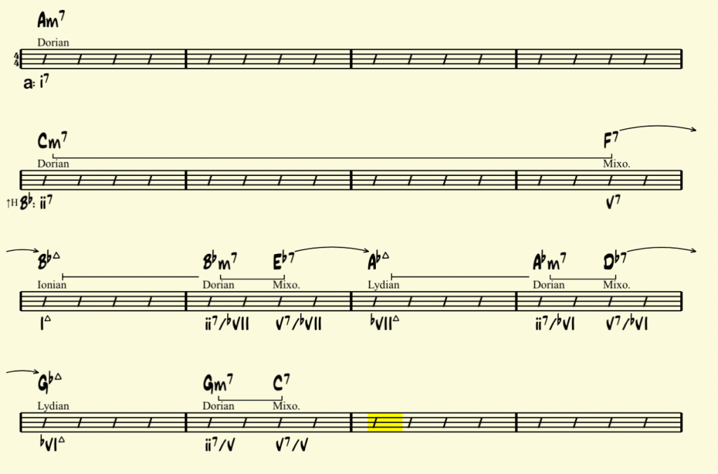 in the key of Bb. It’s still a Dorian sound, but should now be reinterpreted as a iim7 in the key of Bb. Now the map clearly represents the harmonic progression.