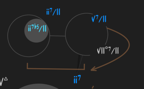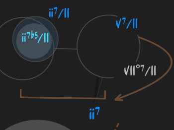 The I is always going to be at 12 o’clock in the tonic region, and the V is always going to be at 1 o’clock in the dominant region. Every function is assigned a fixed place on the map. By doing this, the paths between functions (a.k.a cadences) will also be fixed, like roads connecting different functions or regions of the map. For example: the IV (in the subdominant region) has a path that connects it to the I (the plagal cadence). But, as you can see, the ii also belongs to the subdominant region. Thus, we can also take the plagal path, from the ii to the I, to create a plagal-like cadence. And this is true for other functions that share the same region.