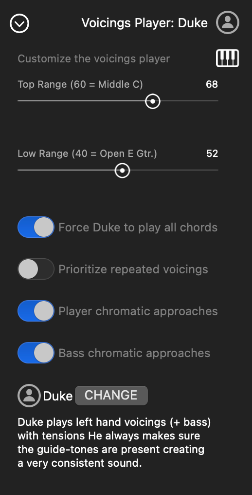 NOTE: The main difference with the voicings keyboard, is that it does not show the voicings being used by the current A.I. player. This is because you could have someone like McCoy loaded as the A.I. player, which will play chords unplayable in a guitar. So this panel has a collection of guitar friendly voicings for every chord/chord-scale pairing.