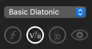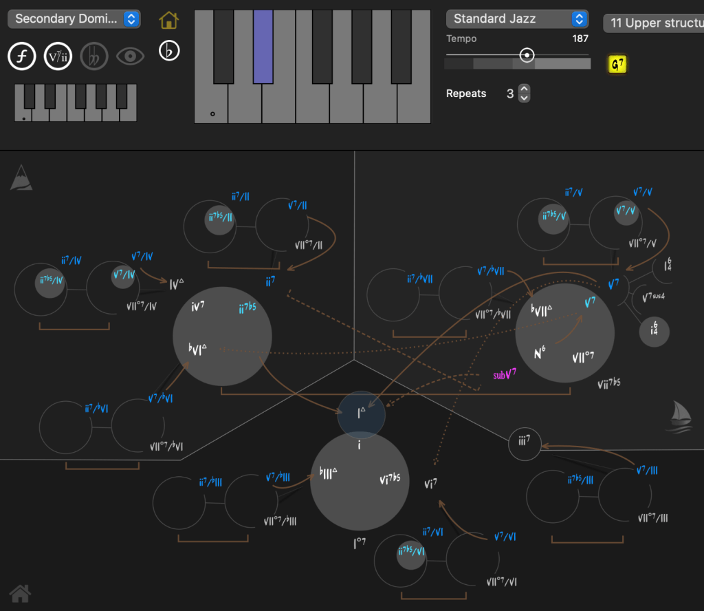 Enable the functional button (cursive f) if you want to see all the chords in the map notated as harmonic functions. In this setting the map will look the same in all keys.