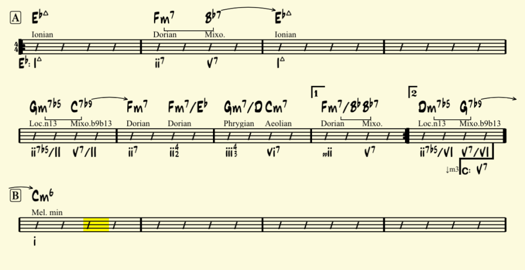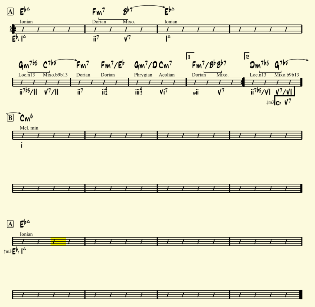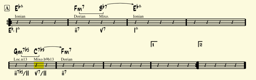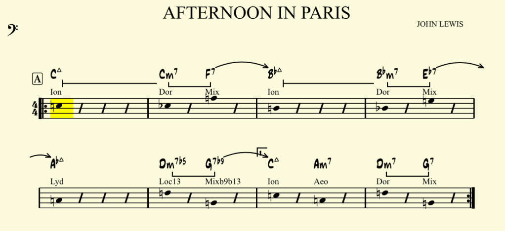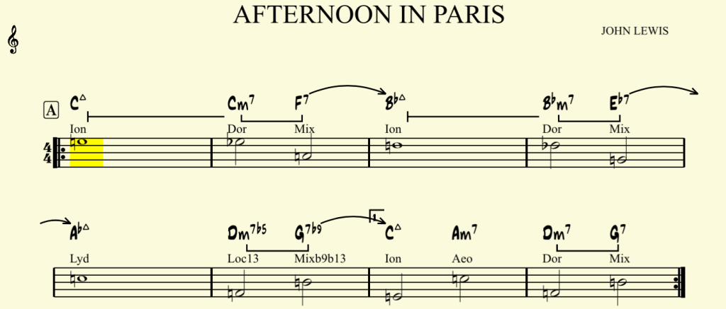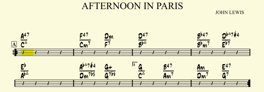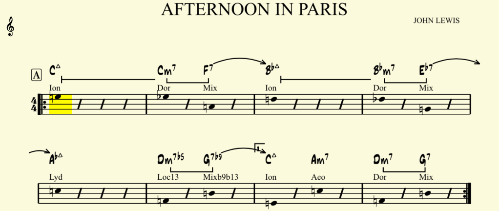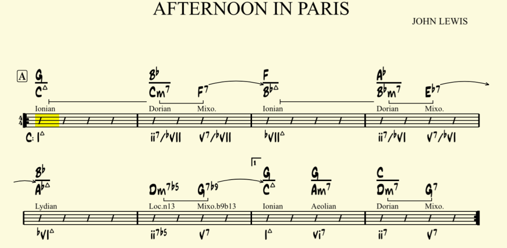 NOTE: Some chords might not have any upper structures of the type available (i.e. in Afternoon in Paris there are no major triads available to use over the Dm7b5 (Locrian n13) or the G7b9 (Mixo b9 b13) chords