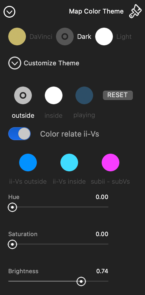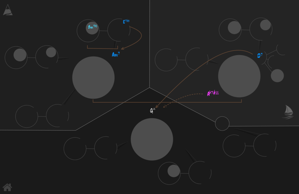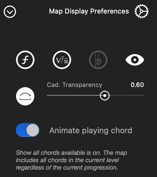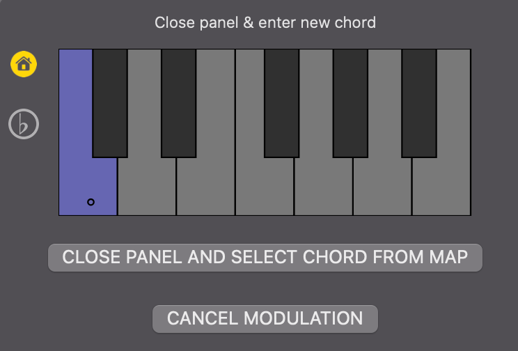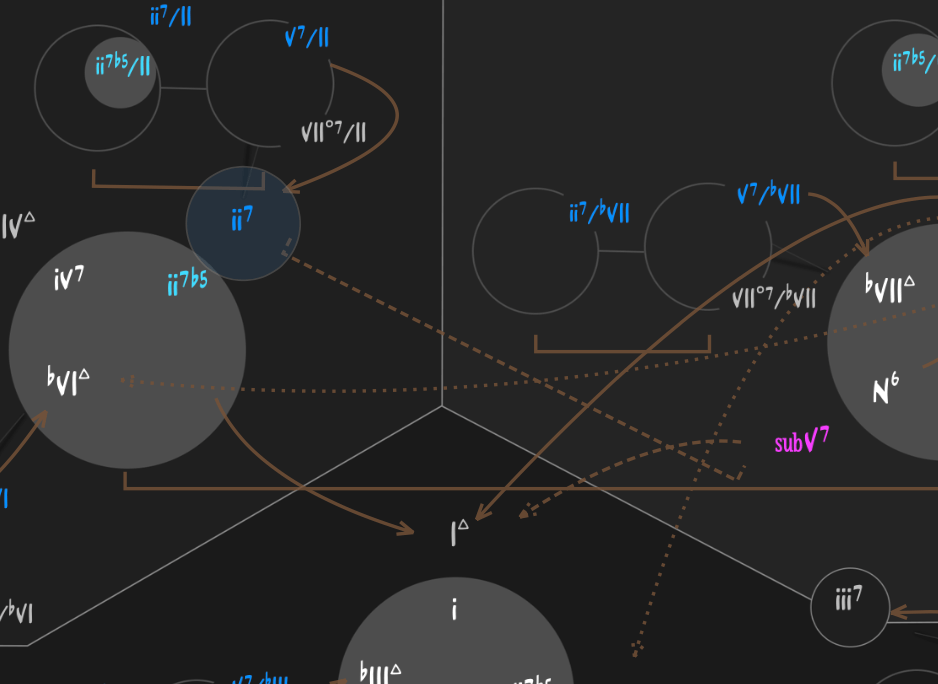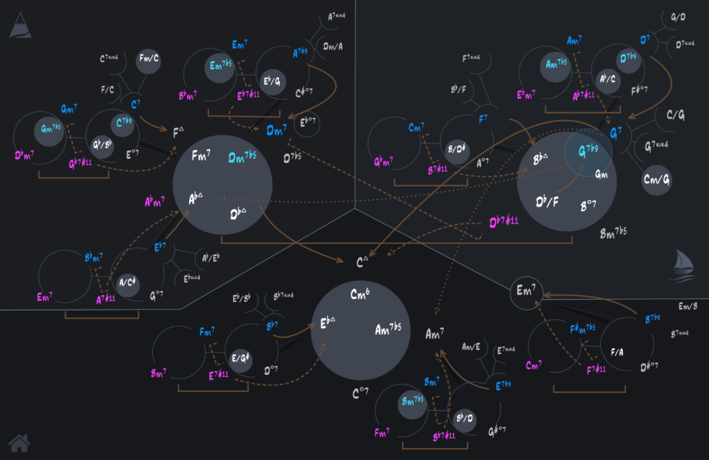 NOTE: Although the map shows chords from major and minor, setting the map to minor will adjust some cadences and paths better suited for the minor mode (it also changes the map background’s hue to let you know that you are in minor)
