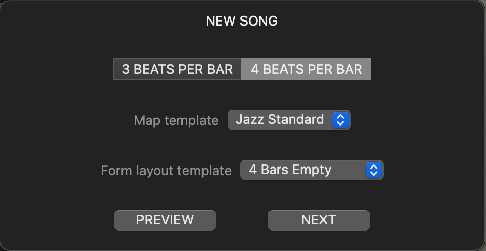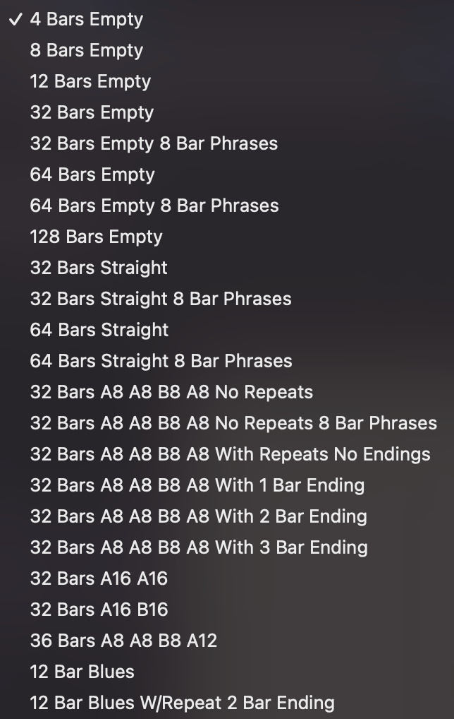 NOTE: The map templates popup is only available if the song is empty (no chords have been added yet.) So if you want to try the different map templates make sure the song has no chords (start a new song, or save your own empty song for that purpose.) This is because once the song has at least one chord, Mapping Tonal Harmony Pro makes sure to load an A.I. player that knows how to play in that style.