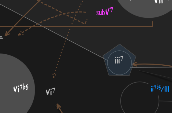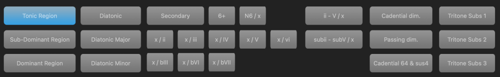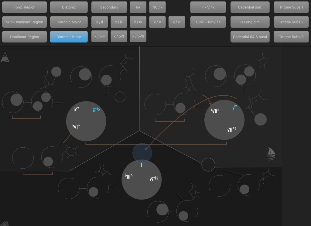 Just hover over any of the buttons, and the map will highlight all the chords that belong to that class of functions. Here’s an example of the diatonic chords in minor: