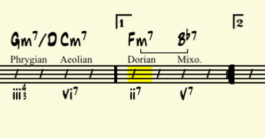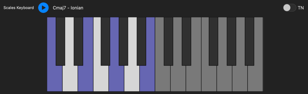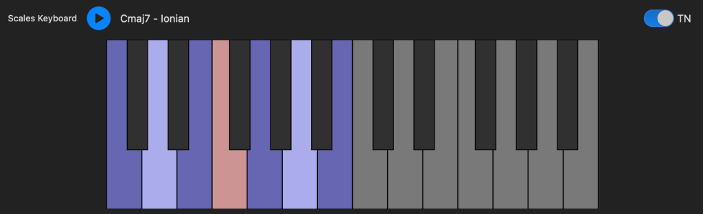 Available tensions will be in light-purple and avoid tensions in shell-pink. (in Cmaj7 – Ionian: C E G B are chord-tones, D and A are available tensions, and F is an avoid tension)