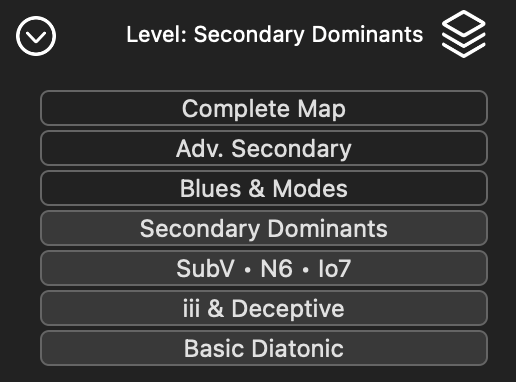 There are 7 map levels. From Basic Diatonic to Complete Map. Each level includes all previous levels. The higher the level, the more complex the map becomes. Every level offers a new harmonic concept not found in previous levels.