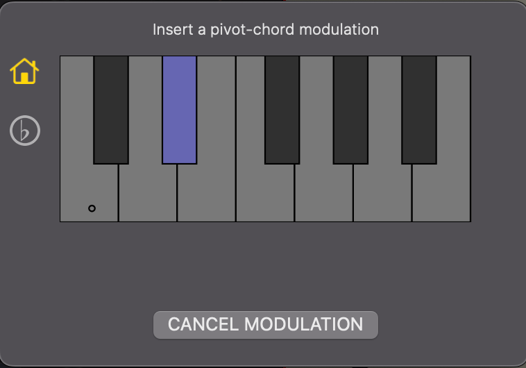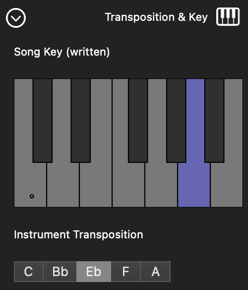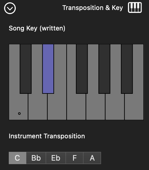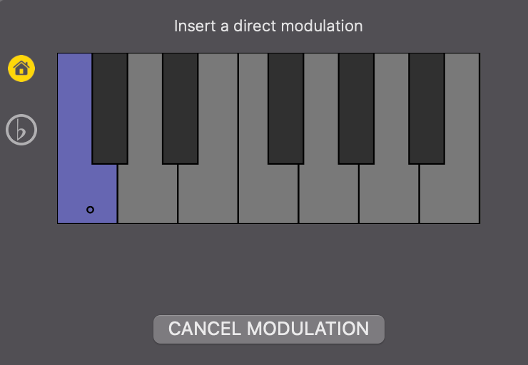 Change the starting key of the current song by using the keyboard in the panel. Use the enharmonic button (flat/sharp) to switch between flats and sharp keys (when available). Use the key button to go back to the original key (the key that was used to create the song). If the song is empty you can toggle between major and minor keys with the house button.