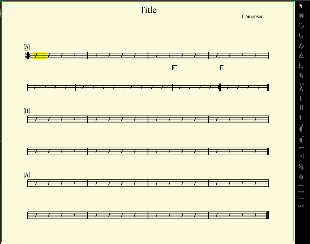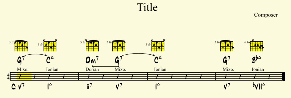 5. There are two working modes: Play Mode & Edit Mode. While a song is playing, both the map and the staff will show the current chord being played. In edit mode, clicking on a chord in the map will add that chord to the selected beat on the staff.