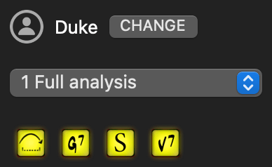 It also shows the bass-detector (not clickable,) which displays the amount of consecutive bass movements created by the sequence of chords being played. If you play chords where the roots move around the circle of fifths the bass detector will show and an arrow. For stepwise motion you’ll see an ascending or descending ladder. And for pedal bass notes you’ll see an anchor. The number next to the symbol represents the amount of times the same bass movement has occurred in a row. Bass movement is crucial in harmony. Things like extended dominants or line clichees show up as large numbers in the bass detector’s consecutive count.
