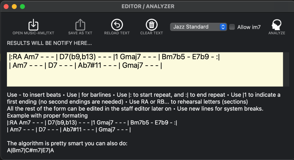 • The Analyzer is able to solve a complete harmonic analysis of any chord progression written in an ordinary text editor. It finds key centers, modulations, pivot chords and of course, functional analysis and chord-scales for every chord in the song.