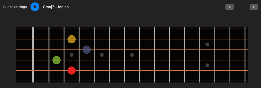 You can listen to the voicing shown by clicking on the play button at the top left. And you can browse available voicings for the current chord/chord-scale pairing with the arrows at the top right. This is another great feature to learn chords on the guitar.