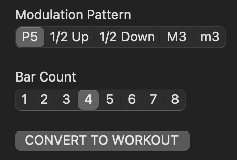 Choose the P5 (perfect fifths) modulation pattern to modulate around the circle of fifths, and select 4 measures in length (because that’s the amount of measure you want to use to create the workout with)