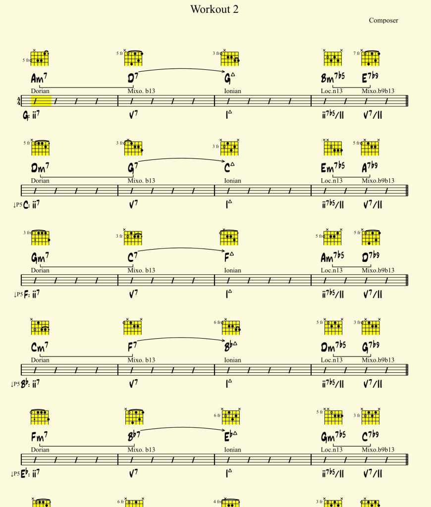 With this tool you can convert a maximum of 8 bars into a workout. The workout will be created using the beginning measures (up to 8) of the piece. These measures will be repeated in all keys using the selected modulation pattern.