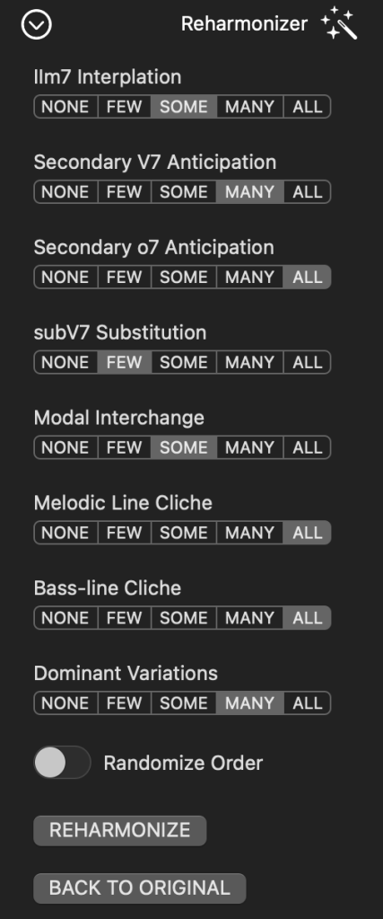Clicking on the REHARMONIZE button several times in a row will reharmonize the previous reharmonization. So you’ll be adding more and more reharms on top of each other. If you want to go back to the original version of the song use the BACK TO ORIGINAL button.