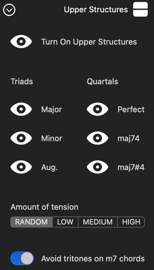 When turned on, they will show up on every chord in a progression, and you will see the complete upper structures panel where you can customize which type of upper structures you want to use.