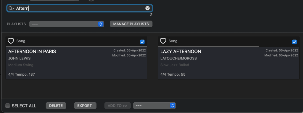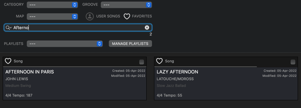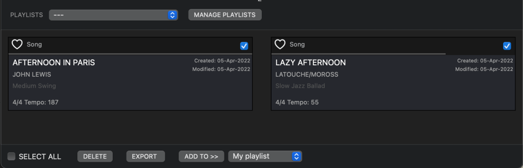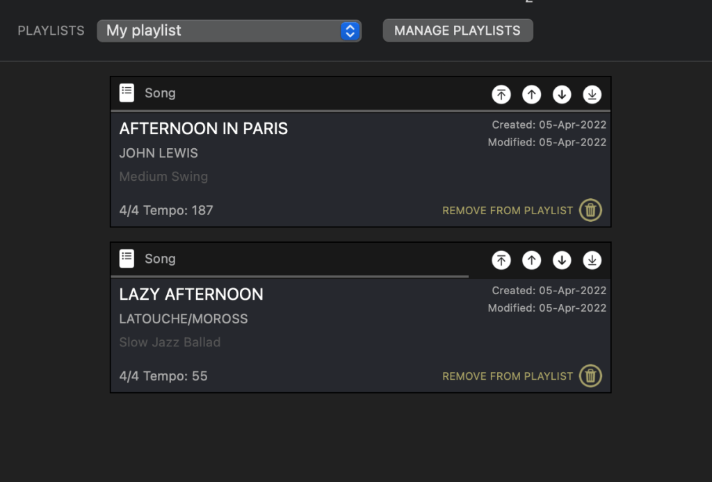 • To view the playlist, just use the PLAYLISTS popup button at the top of the song list, and select the item My playlist. The catalog will turn into a playlist organizer. The song cards will look different because now you are looking at songs in the currently selected playlist (My playlist)
