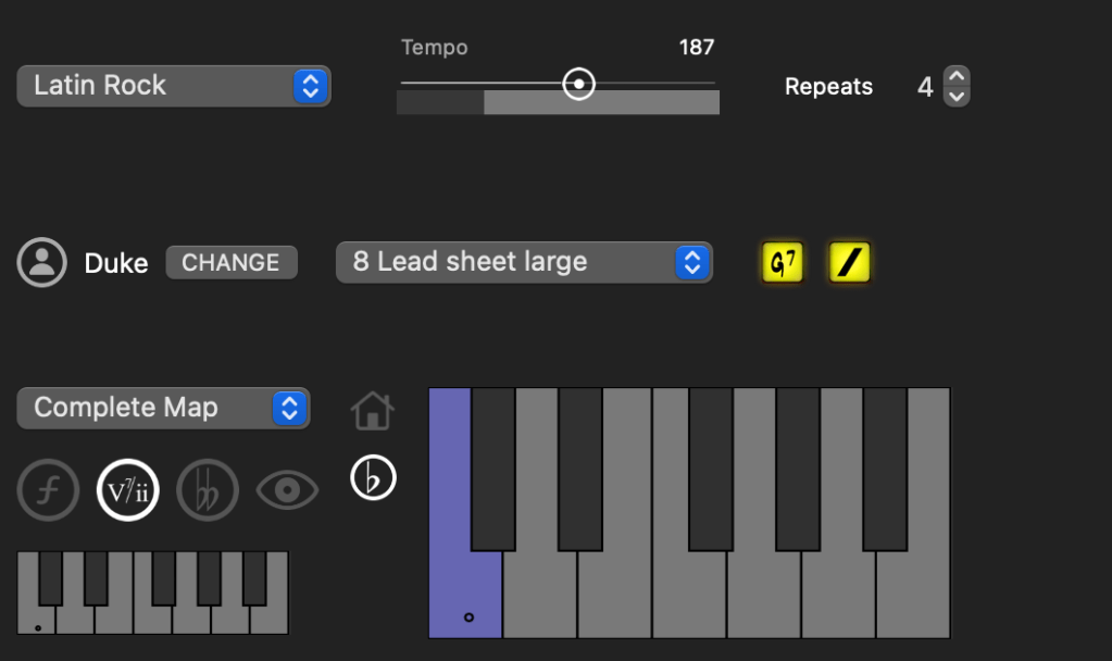 This is a great tool to study piano voicings. Remember, these are the voicings being played by the current A.I. player (which was Duke in the previous pictures.) But if I load another A.I. player (like McCoy) the voicings will be completely different. McCoy likes quartal voicings.