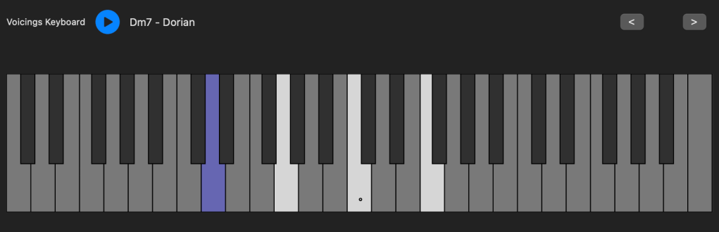 Voicings are created based on the active A.I. player and the harmonic context. Every time you click on a chord the voicing will change depending on those parameters. Here’s the same Dm7 -Dorian chord voicing I got when clicking on the same chord again.