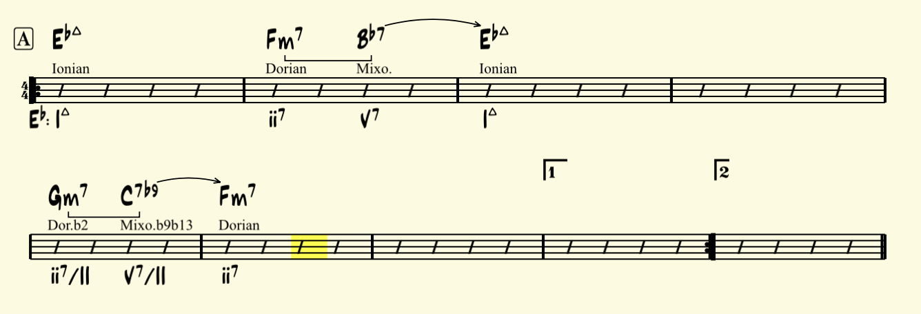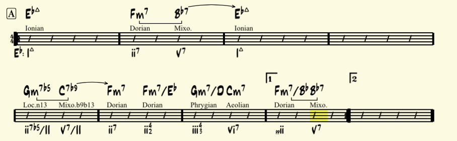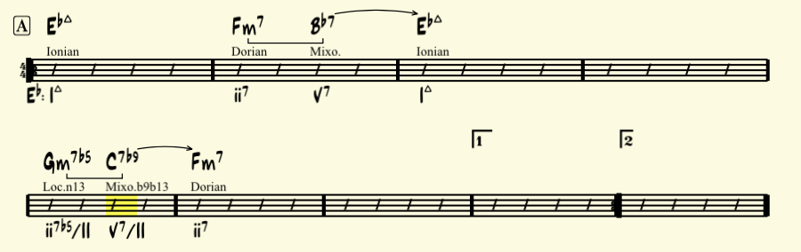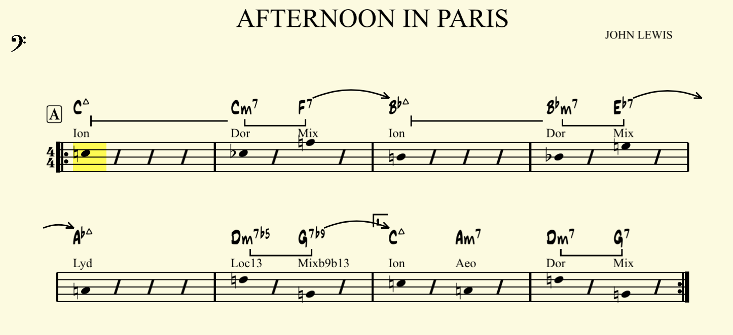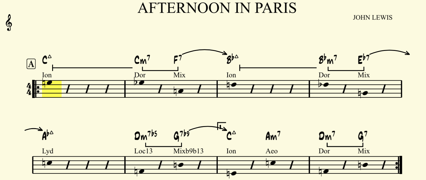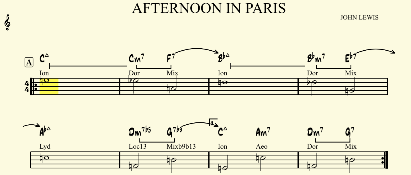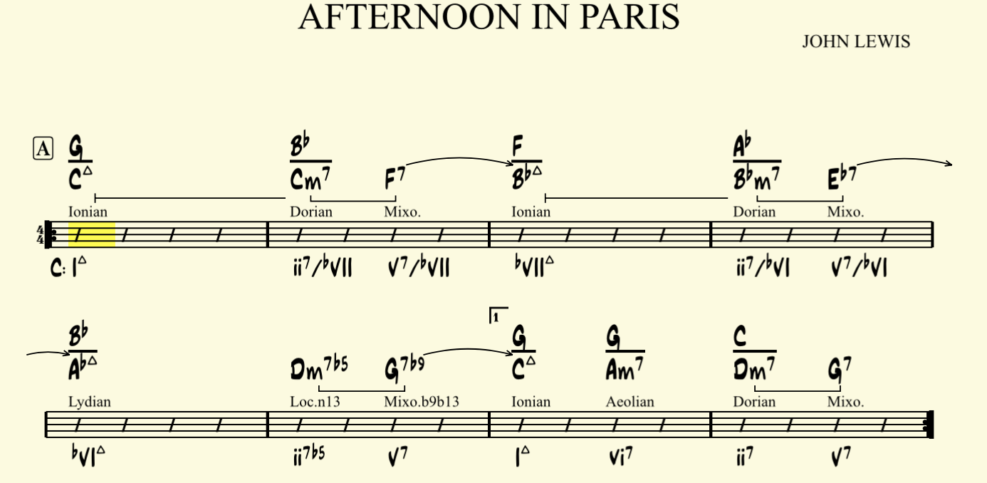 NOTE: Some chords might not have any upper structures of the type available (i.e. in Afternoon in Paris there are no major triads available to use over the Dm7b5 (Locrian n13) or the G7b9 (Mixo b9 b13) chords