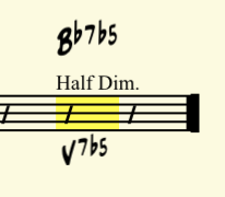 The bass note (in purple) is optional. It is played by the bass. The actual piano voicing is shown in white. Remember, players usually use rootless voicings to give space to the bass player. If you want to learn more about rootless voicings you can check out our Essential Voicings for Jazz Piano Book/Course.