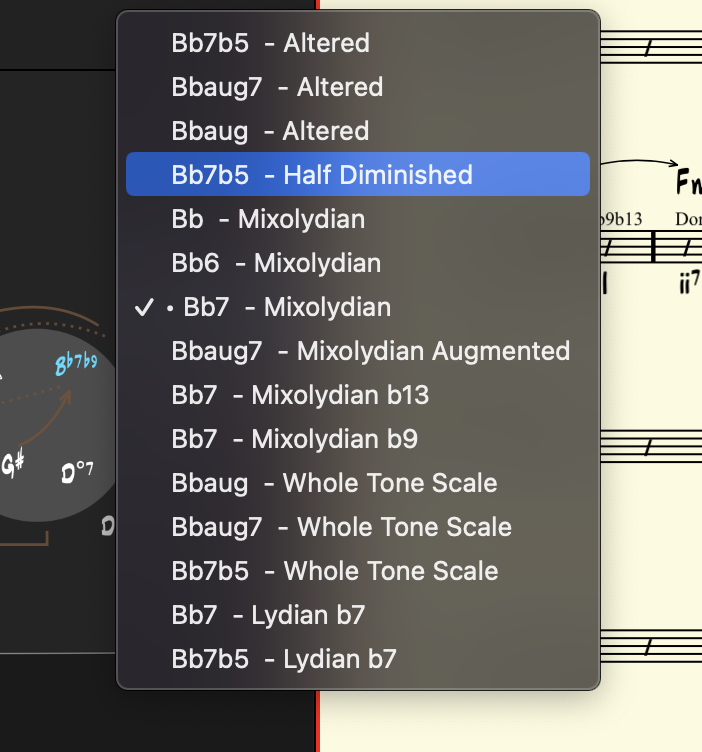 • Right-click on any chord to choose different chord types and chord-scales available for that function.