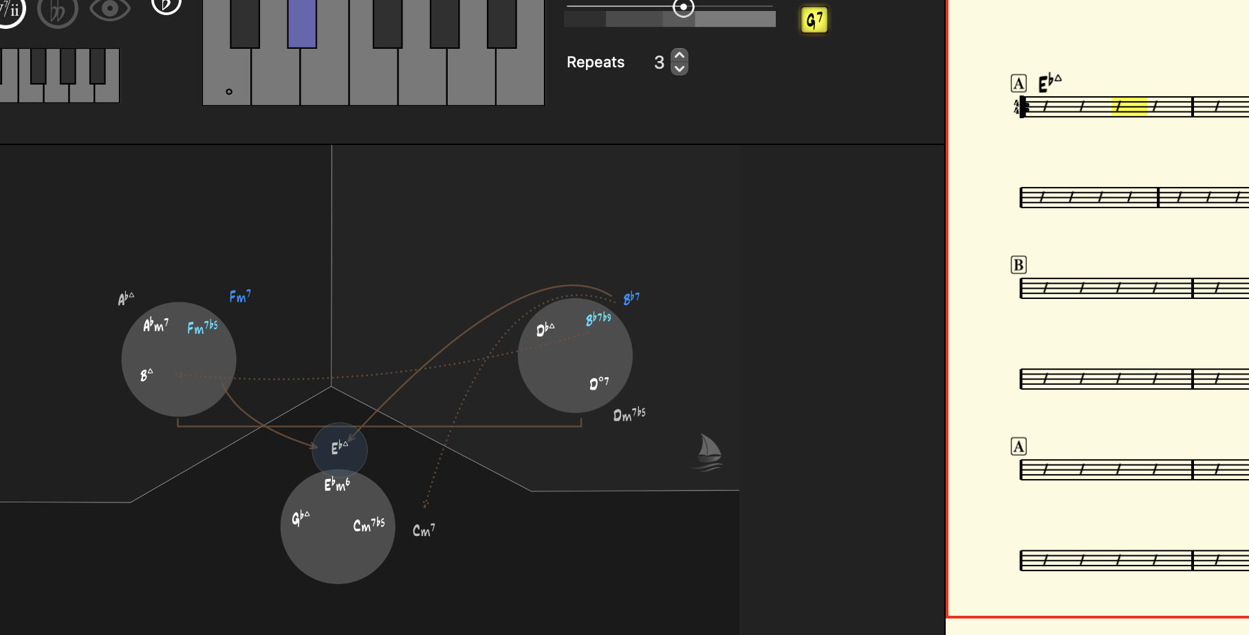 4. The sound, staff and the map are always linked. Clicking on a chord in the staff panel will play the chord and show it on the map.