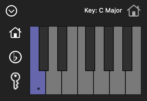 Change the starting key of the current song by using the keyboard in the panel. Use the enharmonic button (flat/sharp) to switch between flats and sharp keys (when available). Use the key button to go back to the original key (the key that was used to create the song). If the song is empty you can toggle between major and minor keys with the house button.