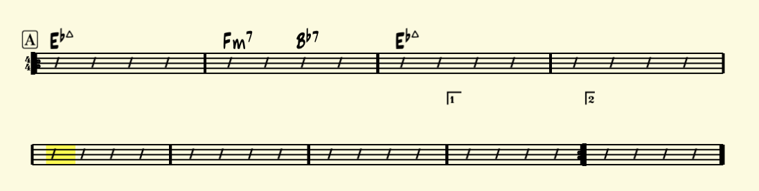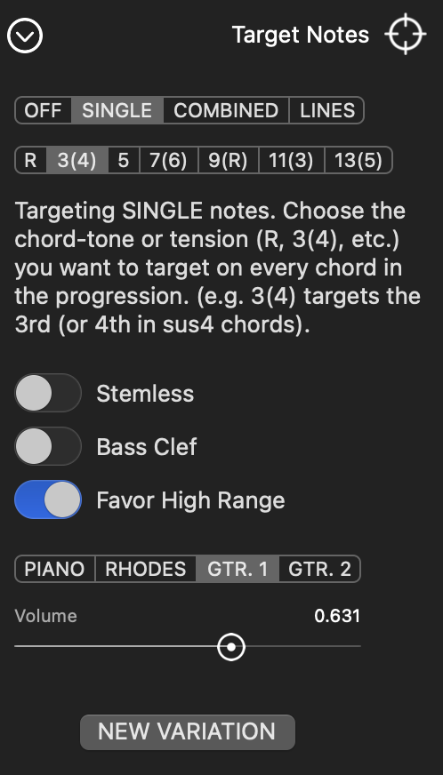 By default, target notes show up as note-figures taking the entire length of the chord (half-notes, whole-notes, etc.) Sometimes, it is useful to see the target notes without the length (because your brain feels free to improvise around them better.) Enable the Stemless button to see target notes as stemless notes and the spaces between notes filled up with slashes.