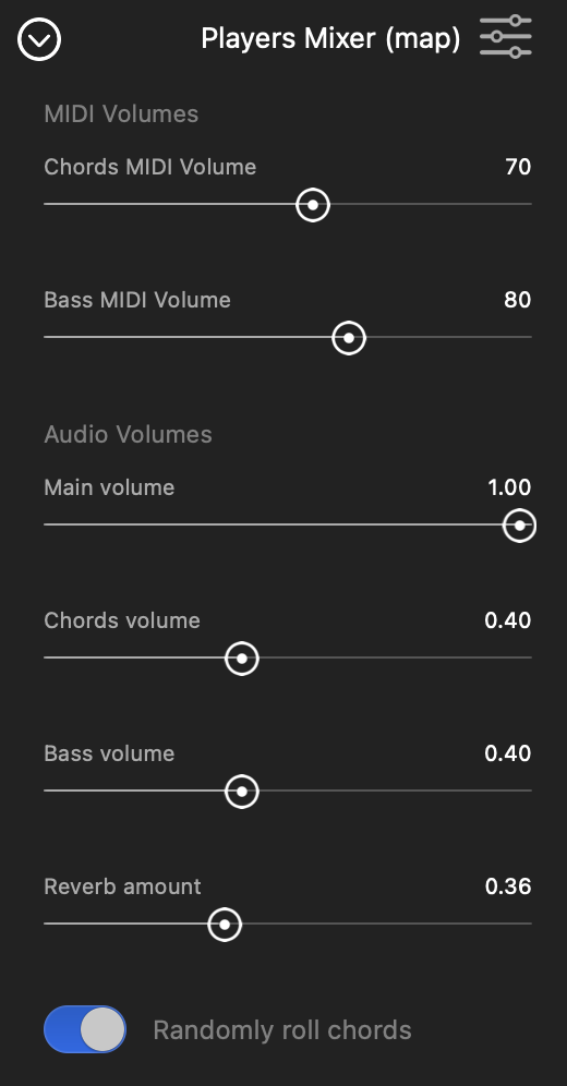 This panel contains a collection of often-used tools to improve your workflow. We have already covered how these work. It is divided in three sections. The top section: play-along settings, the middle section: A.I. player and staff settings, and the bottom section: dedicated to the map.