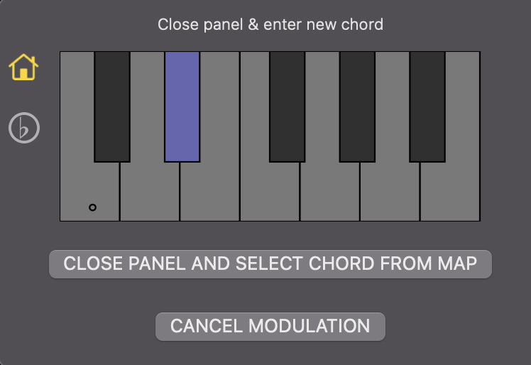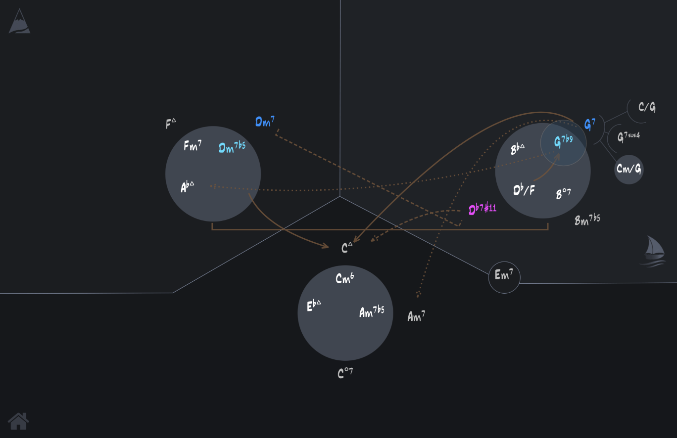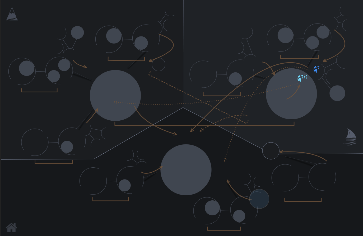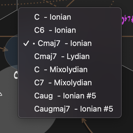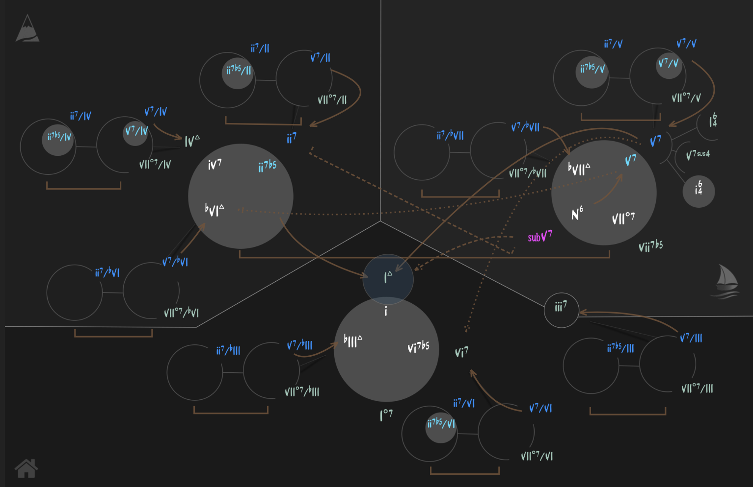 NOTE: Although the map shows chords from major and minor, setting the map to minor will adjust some cadences and paths better suited for the minor mode (it also changes the map background’s hue to let you know that you are in minor)