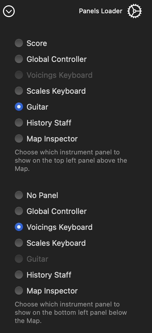 NOTE: The main difference with the voicings keyboard, is that it does not show the voicings being used by the current A.I. player. This is because you could have someone like McCoy loaded as the A.I. player, which will play chords unplayable in a guitar. So this panel has a collection of guitar friendly voicings for every chord/chord-scale pairing.