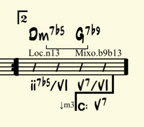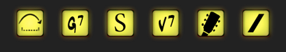 It also shows the bass-detector (not clickable,) which displays the amount of consecutive bass movements created by the sequence of chords being played. If you play chords where the roots move around the circle of fifths the bass detector will show and an arrow. For stepwise motion you’ll see an ascending or descending ladder. And for pedal bass notes you’ll see an anchor. The number next to the symbol represents the amount of times the same bass movement has occurred in a row. Bass movement is crucial in harmony. Things like extended dominants or line clichees show up as large numbers in the bass detector’s consecutive count.