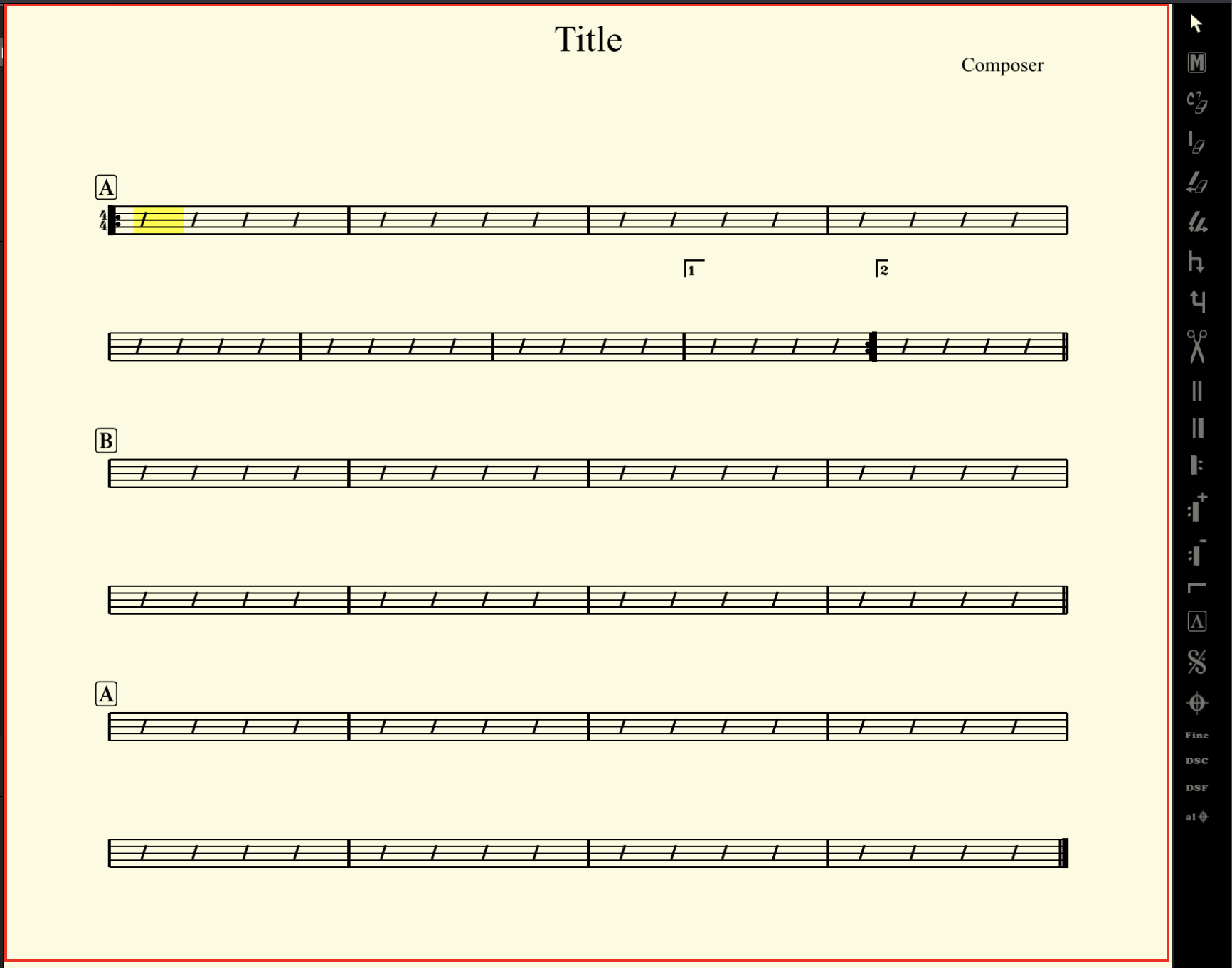 5. There are two working modes: Play Mode & Edit Mode. While a song is playing, both the map and the staff will show the current chord being played. In edit mode, clicking on a chord in the map will add that chord to the selected beat on the staff.