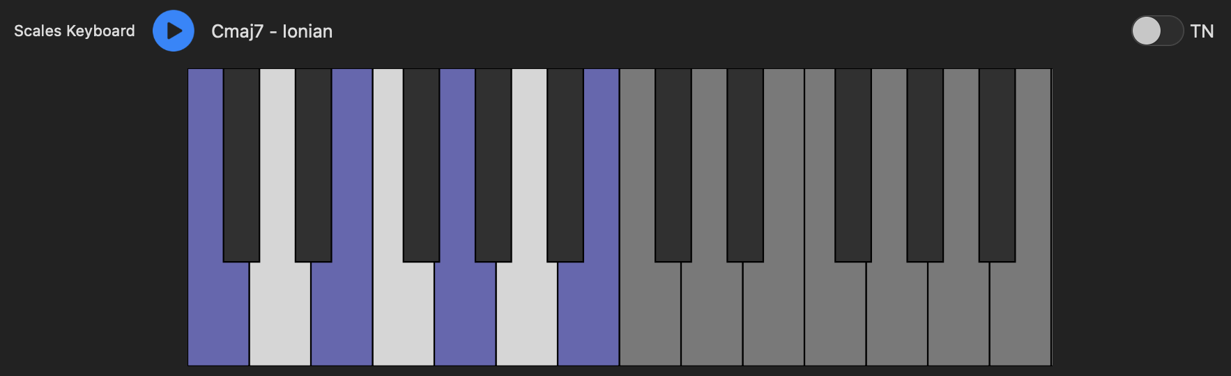 Available tensions will be in light-purple and avoid tensions in shell-pink. (in Cmaj7 – Ionian: C E G B are chord-tones, D and A are available tensions, and F is an avoid tension)