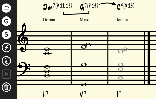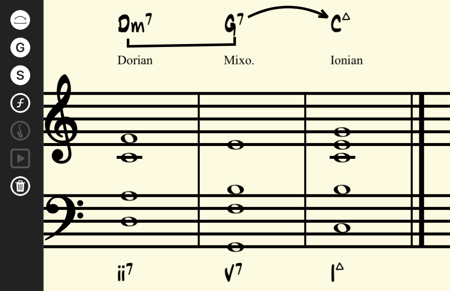 • Play a 2 5 1 progression on the map (one chord at a time.) It will be entered into the history staff.