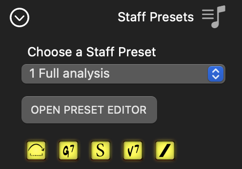 This tool will show one target note per chord, and you can choose the type in this panel. This is a very intuitive tool as well. Make your selection and Mapping Tonal Harmony Pro will show the target notes in the staff.