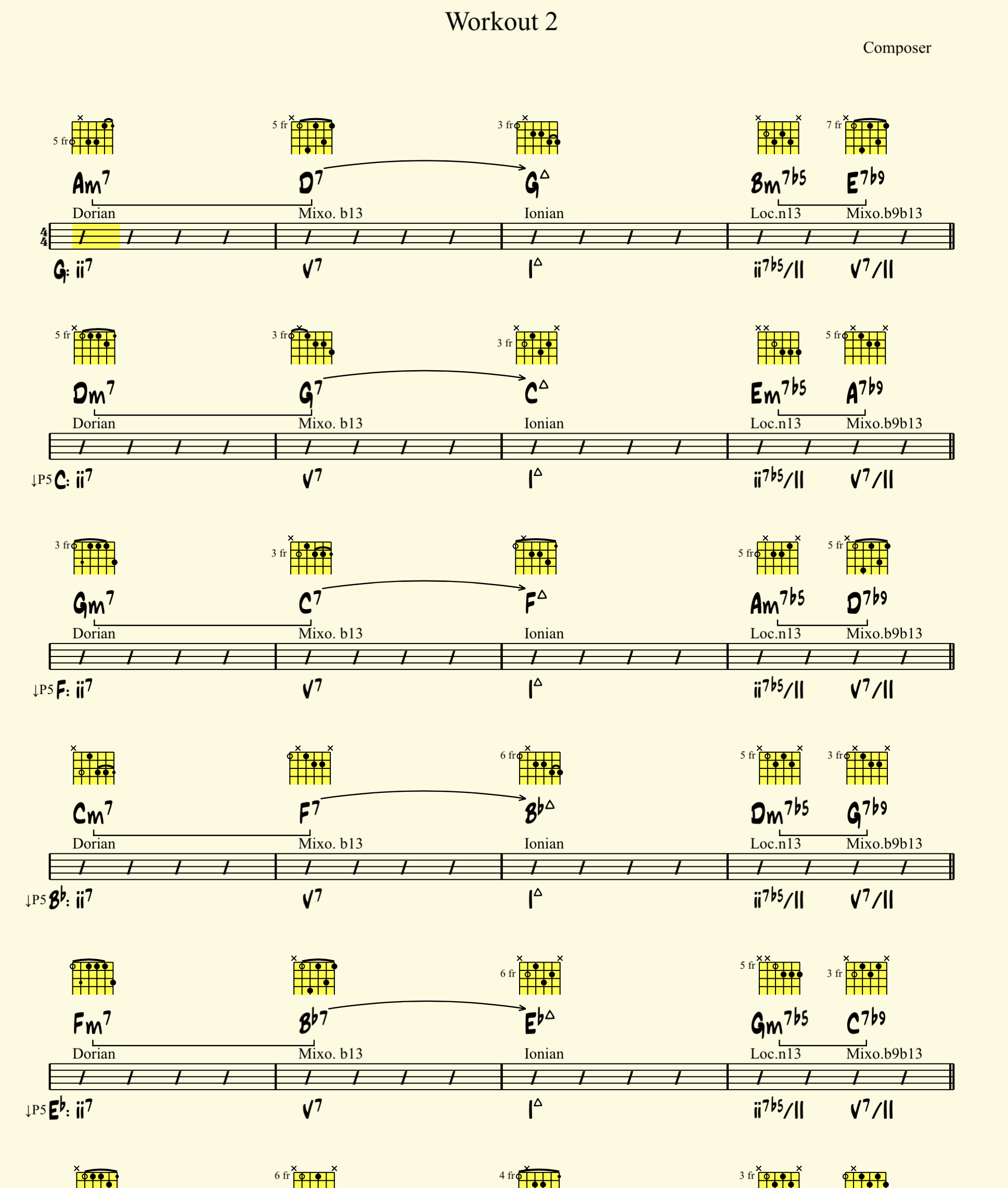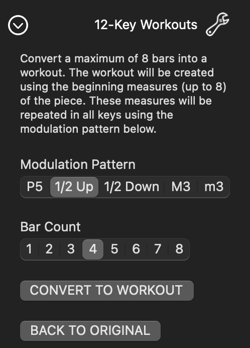 With this tool you can convert a maximum of 8 bars into a workout. The workout will be created using the beginning measures (up to 8) of the piece. These measures will be repeated in all keys using the selected modulation pattern.