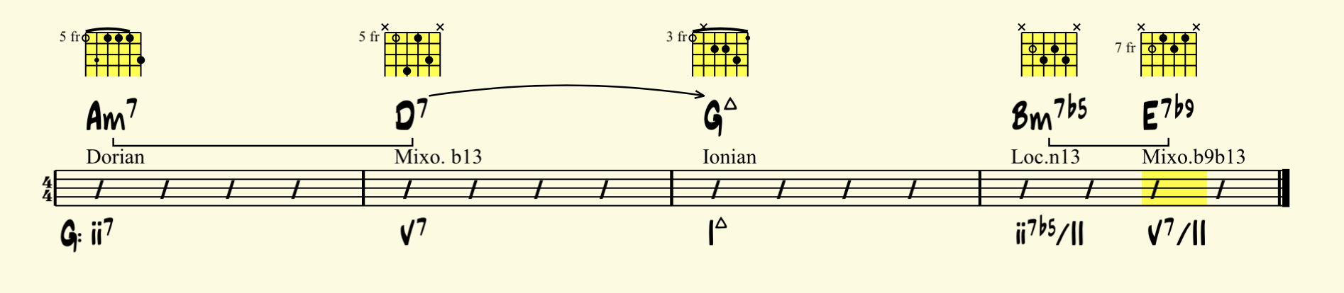 Let’s say you have entered a ii – V – I – [ii/ii – V/ii] progression and you want to practice playing over it in all keys around the circle of fifths (G Major to C major to F major…)