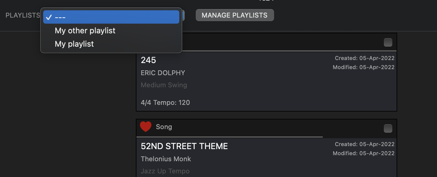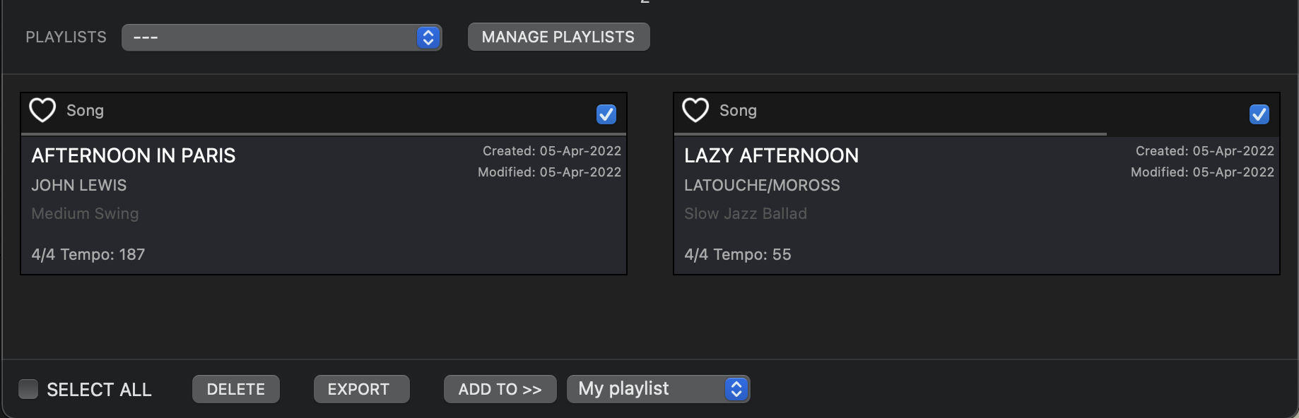 • To view the playlist, just use the PLAYLISTS popup button at the top of the song list, and select the item My playlist. The catalog will turn into a playlist organizer. The song cards will look different because now you are looking at songs in the currently selected playlist (My playlist)