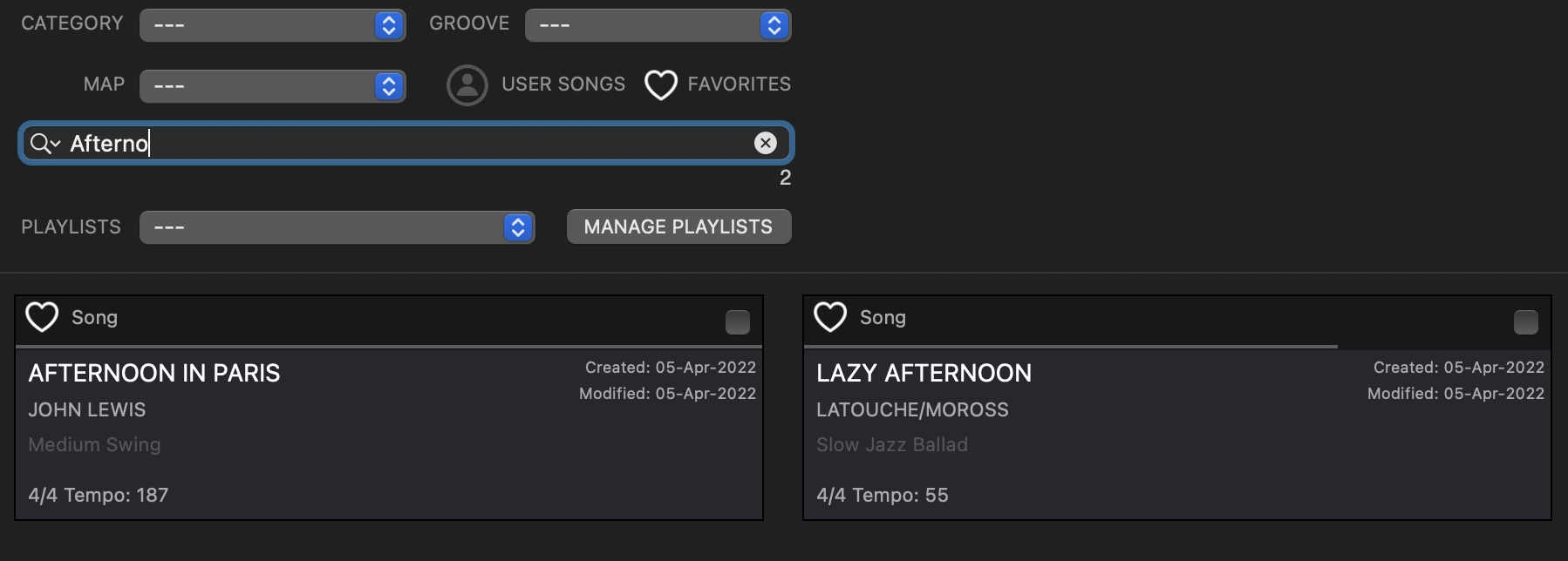 • Type Afterno in the search text box to look for songs that contain that text in the title