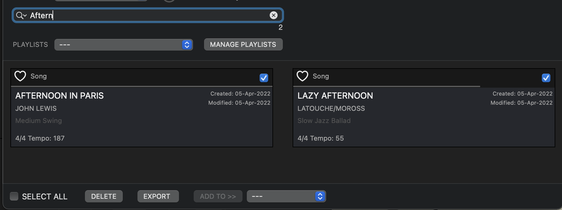 • Select both songs (by clicking on the check box at the top of each song-card)