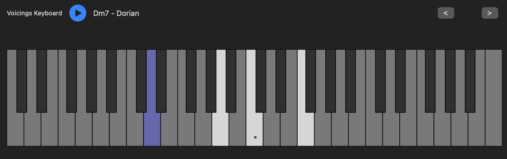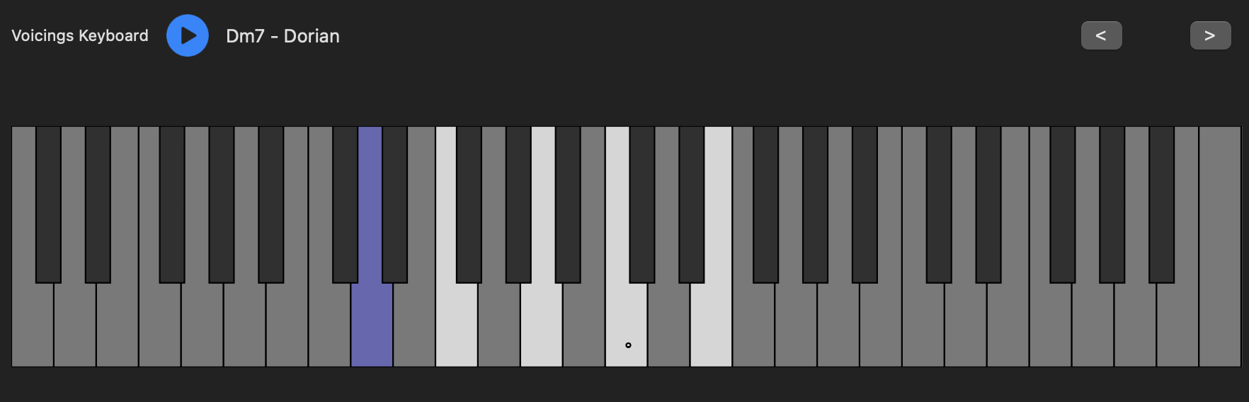 Voicings are created based on the active A.I. player and the harmonic context. Every time you click on a chord the voicing will change depending on those parameters. Here’s the same Dm7 -Dorian chord voicing I got when clicking on the same chord again.