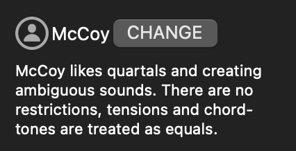 This is a great tool to study piano voicings. Remember, these are the voicings being played by the current A.I. player (which was Duke in the previous pictures.) But if I load another A.I. player (like McCoy) the voicings will be completely different. McCoy likes quartal voicings.