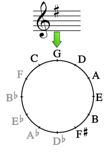 So, that is the circle in C major. Let’s say we have a piece in G major – with one sharp in the key signature. Then, all we have to do is rotate the circle counter-clockwise once, to get the G at the top, and we have a circle of fifths in the key of G major.